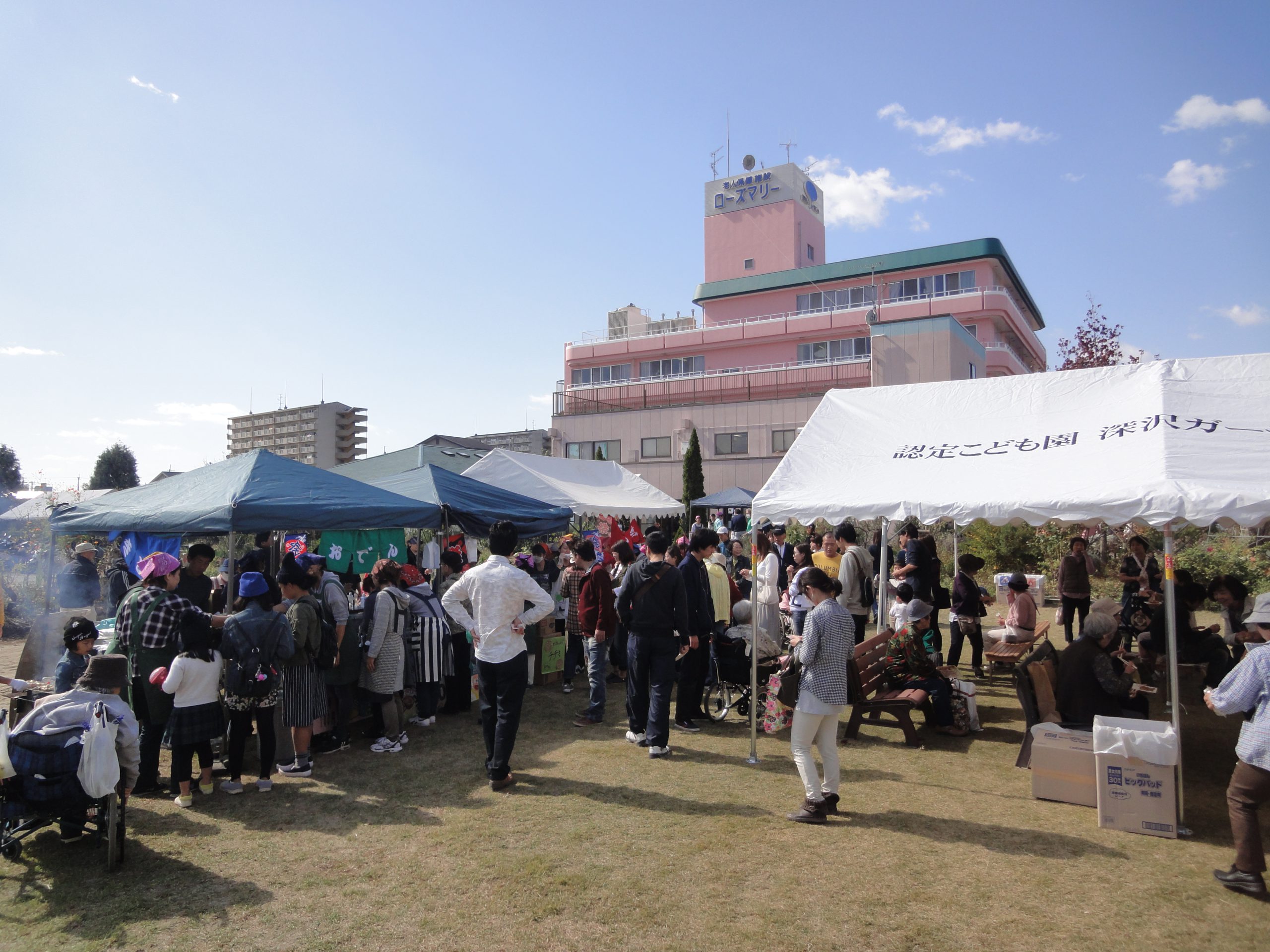 イベント情報 Top > イベント情報 > ローズマリー祭 ローズマリー祭 2015年10月26日 10月25日 第16回ローズマリー祭を開催しました。 素晴らしい秋晴れの中、たくさんのお客様がきてくれて、例年以上の盛り上がりでした。 バザーや利用者さんが作成した作品展示、焼きそばやたこ焼きなどの模擬店、『ネイチャーたかつき』さんによる自然材料の工作など、楽しい催しがたくさんあって、利用者さんも楽しまれていて良かったです!