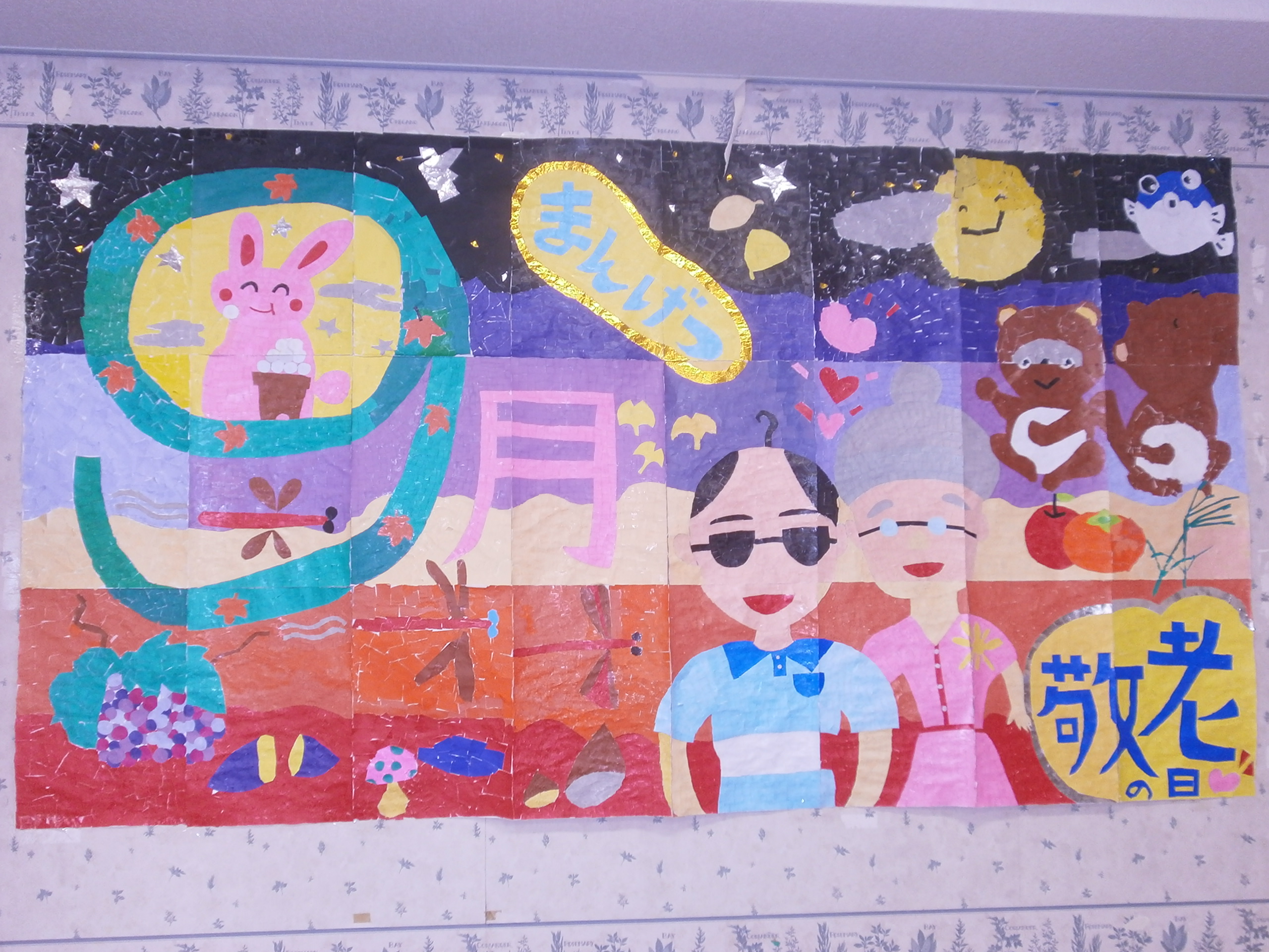 デイケア利用者の皆さんで協力して作成した、切り絵の壁画の9月版が完成しました!9月といえばお月見ですね!月のウサギや月見団子、タヌキさんとかわいいポップな作品です!中央の人がタ〇リさんに見えるのは気のせい!? 10月は一体どんなテーマになるんでしょう!楽しみにしています!