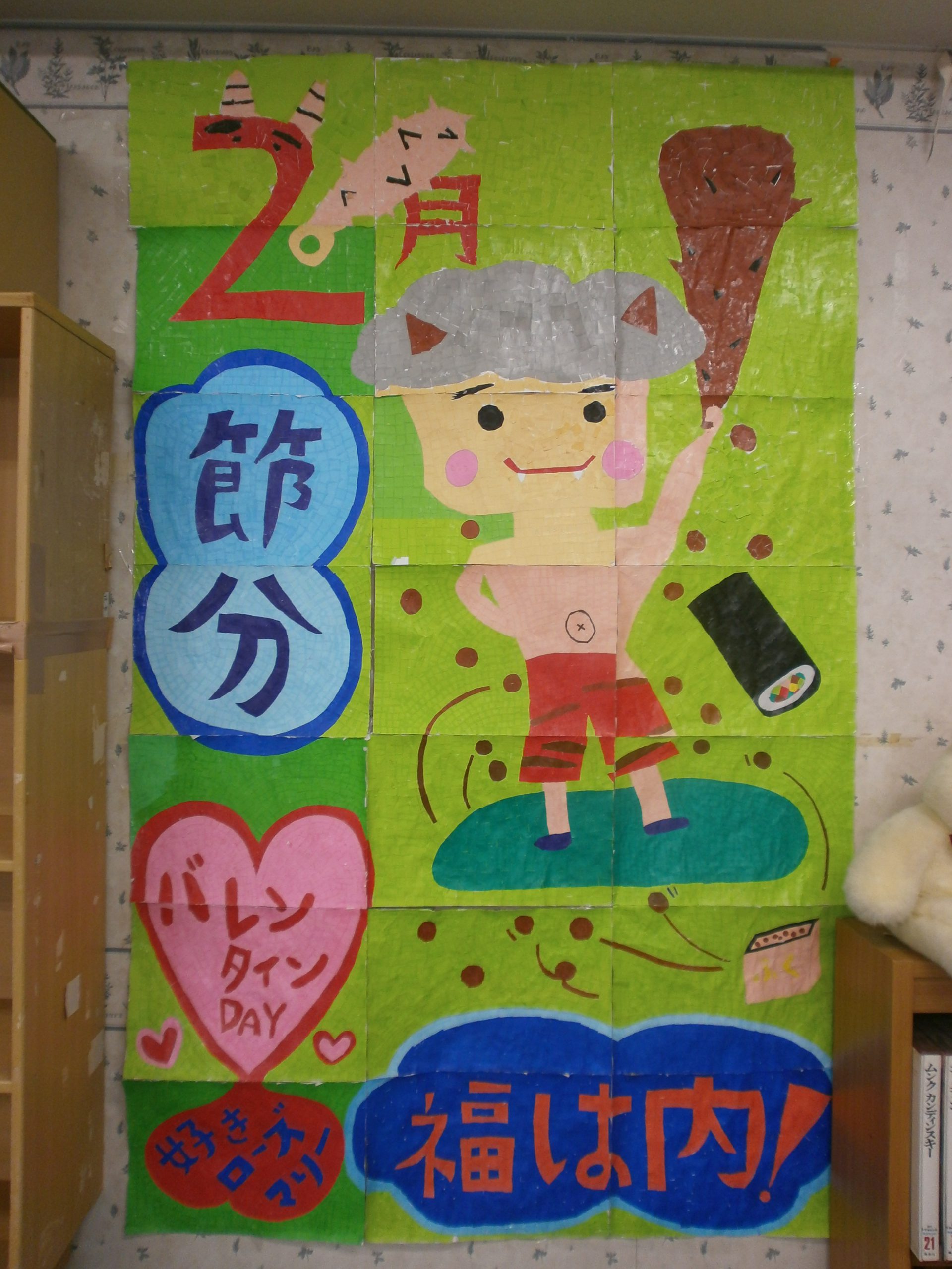 スタッフブログ Top > スタッフブログ > デイケア壁画 2月ver. デイケア壁画 2月ver. 2017年2月1日 デイケア利用者の皆さんが、協力して作成した壁画の2月版が完成しました!今月は節分という事で、だいぶかわいい鬼さんです!豆を投げたら泣いてしまいそうですね(笑)今年は雪が降る回数も多くて、寒い日が続きますが、風邪などひかないように頑張りましょう!春はもうすぐですよ!