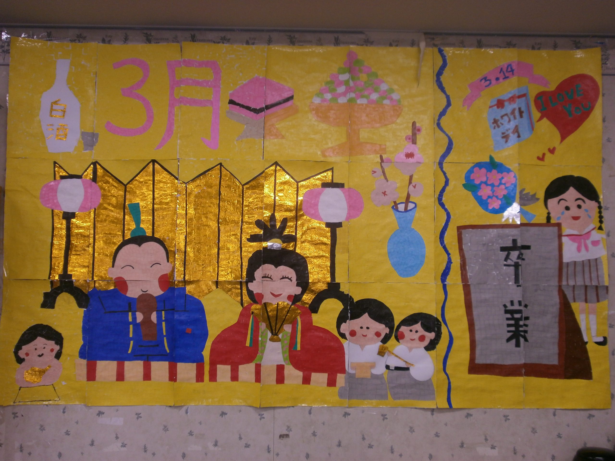 スタッフブログ Top > スタッフブログ > デイケア壁画 3月ver. デイケア壁画 3月ver. 2017年3月10日 デイケア利用者の皆さんが、協力して作成した壁画の3月版が完成しました!今月はひな祭りと卒業シーズンがメインテーマですね。全体的な色使いが、春の訪れを感じさせる暖色系で、気分も明るくなりますね。