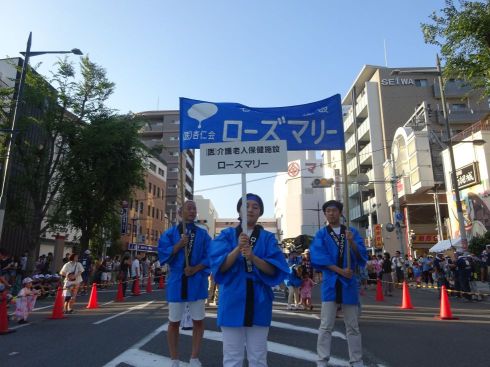イベント情報 Top > イベント情報 > 高槻まつり 高槻まつり 2018年8月10日 8月4日(土)踊り連 恒例のトップバッターで参加 今年は、直前に地震や台風等で、お祭り自体も危ぶまれましたが、無事開催されました。 入所者様・スタッフ、おそろいのハッピを着て、高槻音頭を踊ります。 ♪エー ソレソレ 一おどり♪ 沿道で応援して下さった方々、ありがとうございました!