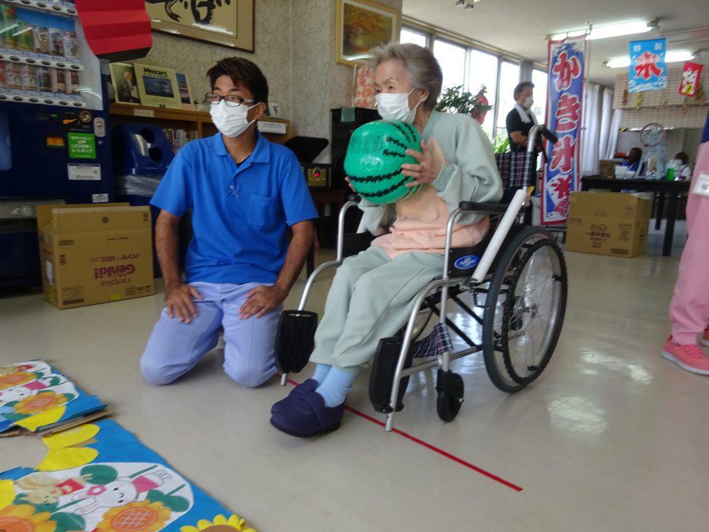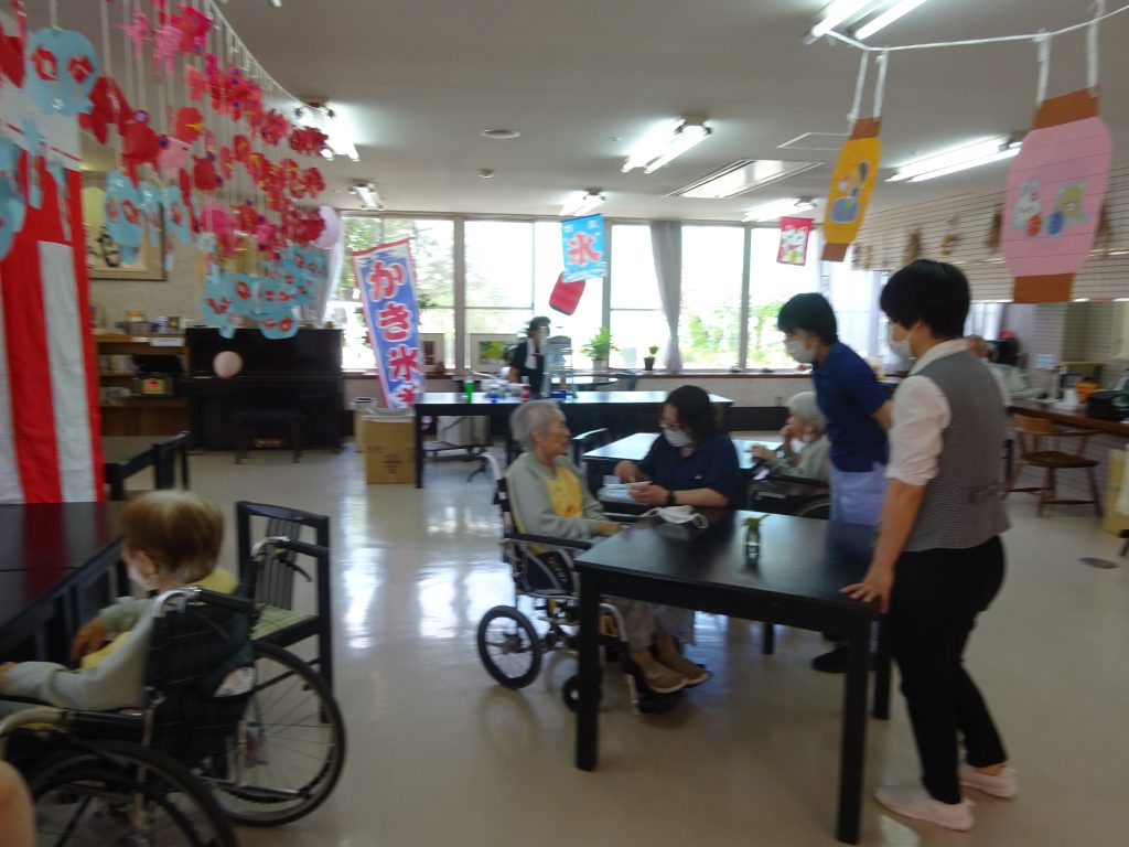 飾りつけもして、お祭り風の音楽も流し、目の前で、ベビーカステラやかき氷を作ってもらって食べて頂きました。また、ゲームもしたりと、みなさんとっても良い笑顔でした。昔の楽しい夏まつりを思い出してくれたでしょうか。