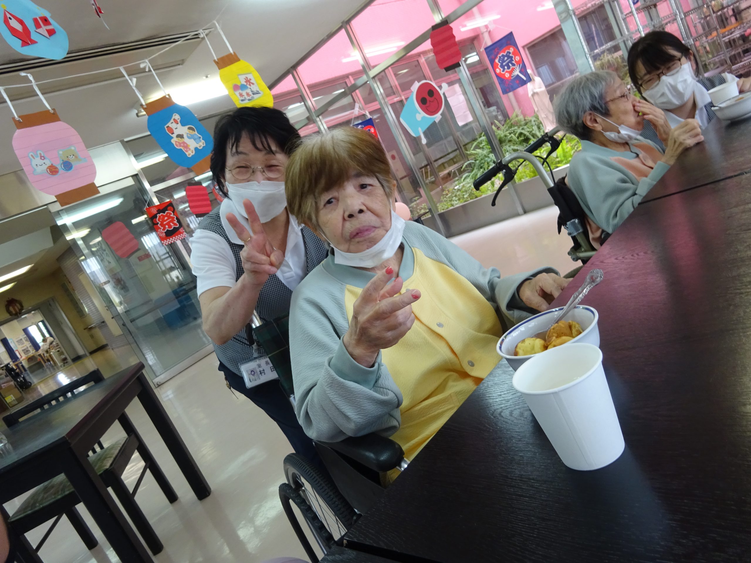 飾りつけもして、お祭り風の音楽も流し、目の前で、ベビーカステラやかき氷を作ってもらって食べて頂きました。また、ゲームもしたりと、みなさんとっても良い笑顔でした。昔の楽しい夏まつりを思い出してくれたでしょうか。
