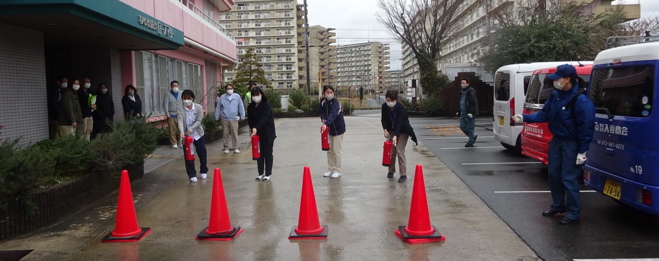 イベント情報 Top > イベント情報 > 消防・避難訓練 消防・避難訓練 2025年3月17日 消防・避難訓練を行いました。今回は高槻市中消防署から後藤様、橋本様にお越しいただきました。いつもは笑顔のスタッフも、訓練時は真剣そのもの。訓練後に講評をしていただき、消火器や消火散水栓の使い方などを教えて頂きました。火事はいつ起こるか分かりません。万が一の際には冷静に行動できるよう、これからも訓練を重ねていきたいと思います。