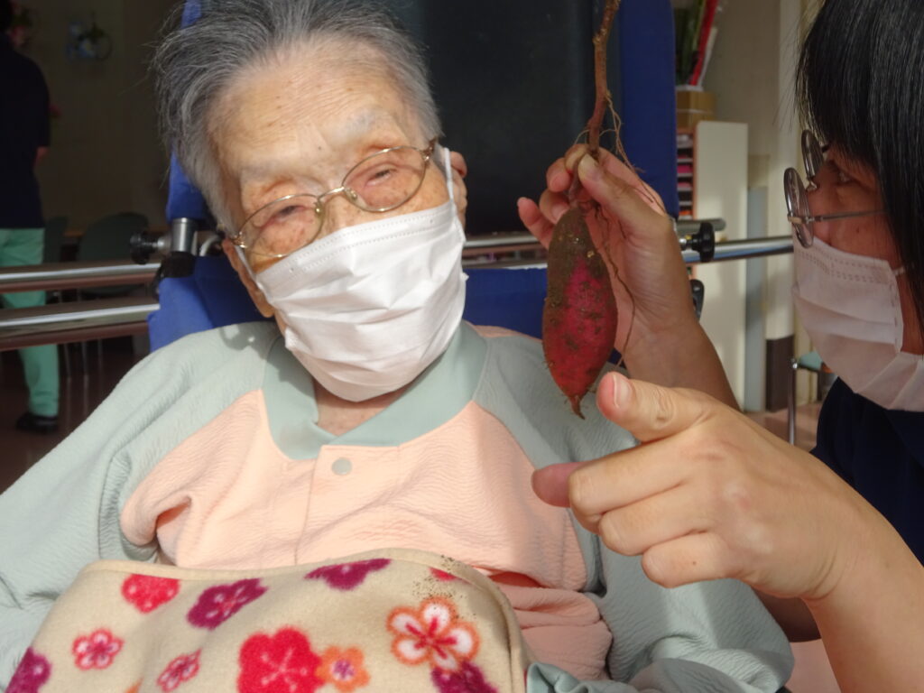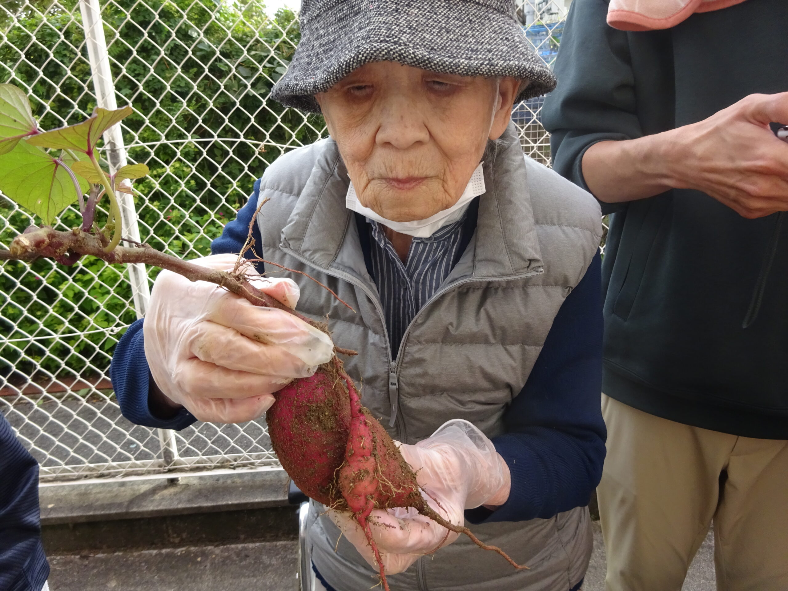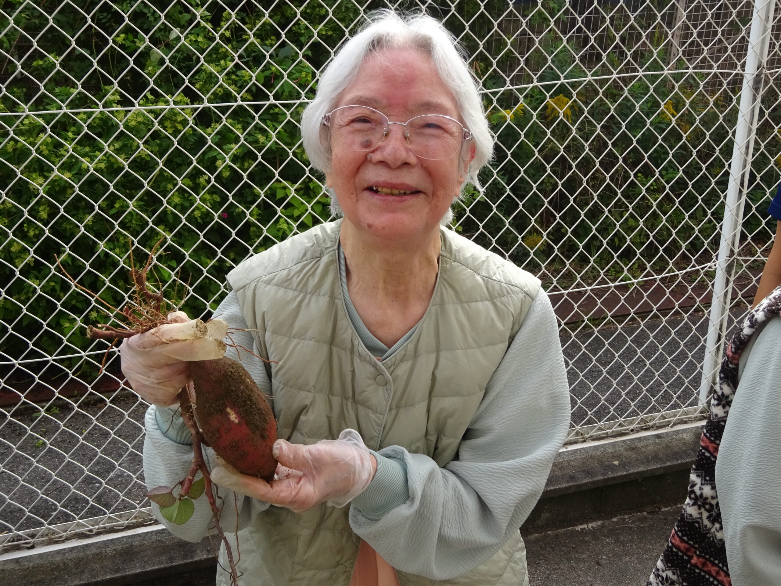 お芋ほりをしました! 今年もお芋ほりの季節になりました!とても天気が良く、少し肌寒くはありましたが、お芋ほりを楽しみました。この畑はリハビリ室の南側でとても日当たりが良く、高さも車椅子に丁度良い高さとなっています。 みなさん一生懸命お芋をほり起こしてくれました。そのおかげで大量のお芋が取れました!! みなさん良い笑顔ですね😊 2025年11月4日 rosemary114