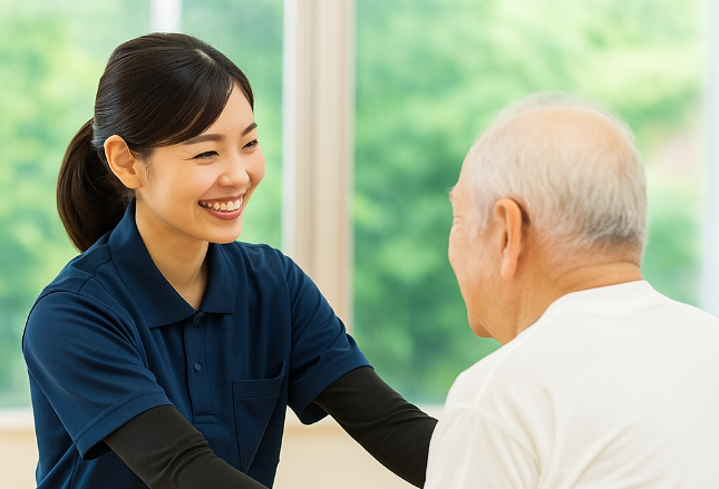 作業療法では、日常生活動作が出来るだけ自立して行えるように方法や環境について評価・援助します。食事動作やトイレ動作、更衣、整容、外出、家事など、といった活動について生活様式に合わせた方法を援助します。